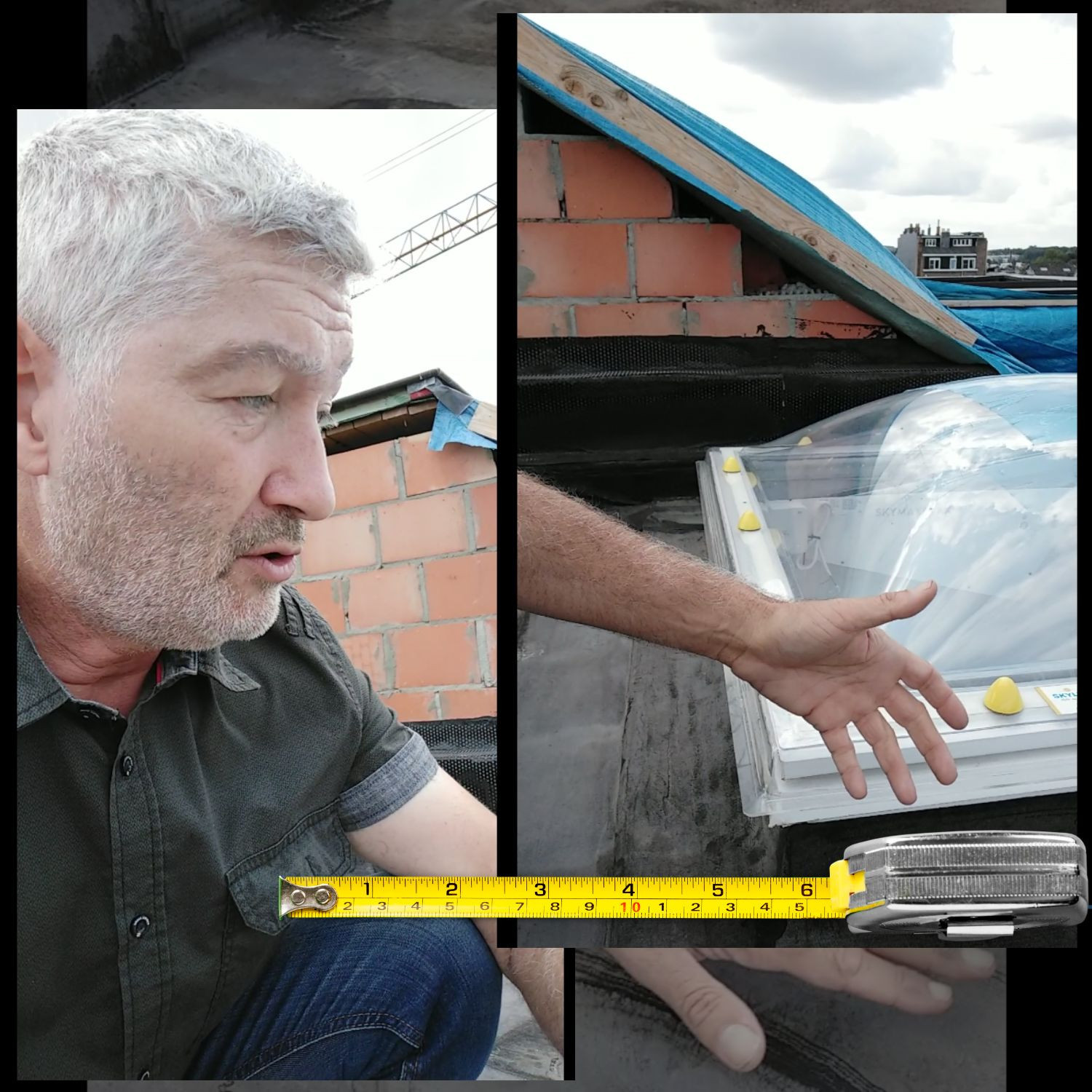 Luc, onze groendak expert inspecteert zorgvuldig een plat dak terwijl hij aantekeningen maakt over de technische staat ervan.